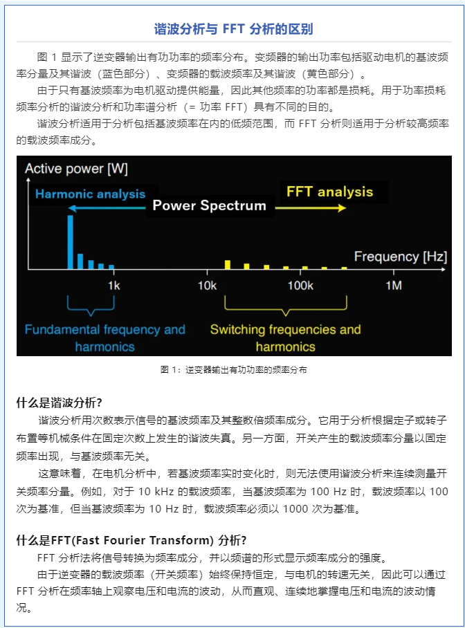 近年來,采用功率半導(dǎo)體 SiC 和 GaN 的高效逆變器的開發(fā)取得了進(jìn)展,這種逆變器可以實(shí)現(xiàn)高速開關(guān)。然而,在變頻驅(qū)動(dòng)系統(tǒng)中,真正能夠被輸入至電機(jī)進(jìn)而直接產(chǎn)生旋轉(zhuǎn)力的僅僅只是基波功率,其它高頻成分則會(huì)作為無效能量(熱能、聲能以及振動(dòng)能)被損耗。因此,減少高頻功率損耗是開發(fā)高效變頻電機(jī)系統(tǒng)的重點(diǎn),需要精確的功率測(cè)量數(shù)據(jù)來分析相關(guān)因素。