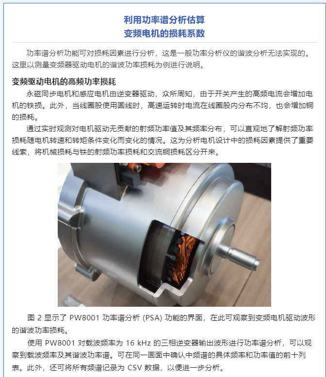 本案例介紹了普通功率分析儀的諧波分析與 PW8001 高精度功率分析儀的功率譜分析 (PSA) 功能之間的區(qū)別,以及利用功率譜分析估算變頻電機(jī)損耗系數(shù)的方法。